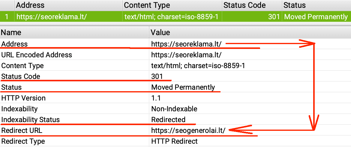 Žemiau yra pateiktas 301 nukreipimo pavyzdys: kuomet adresas https://seoreklama.lt visam laikui nukreipiamas į adresą https://seogenerolai.lt